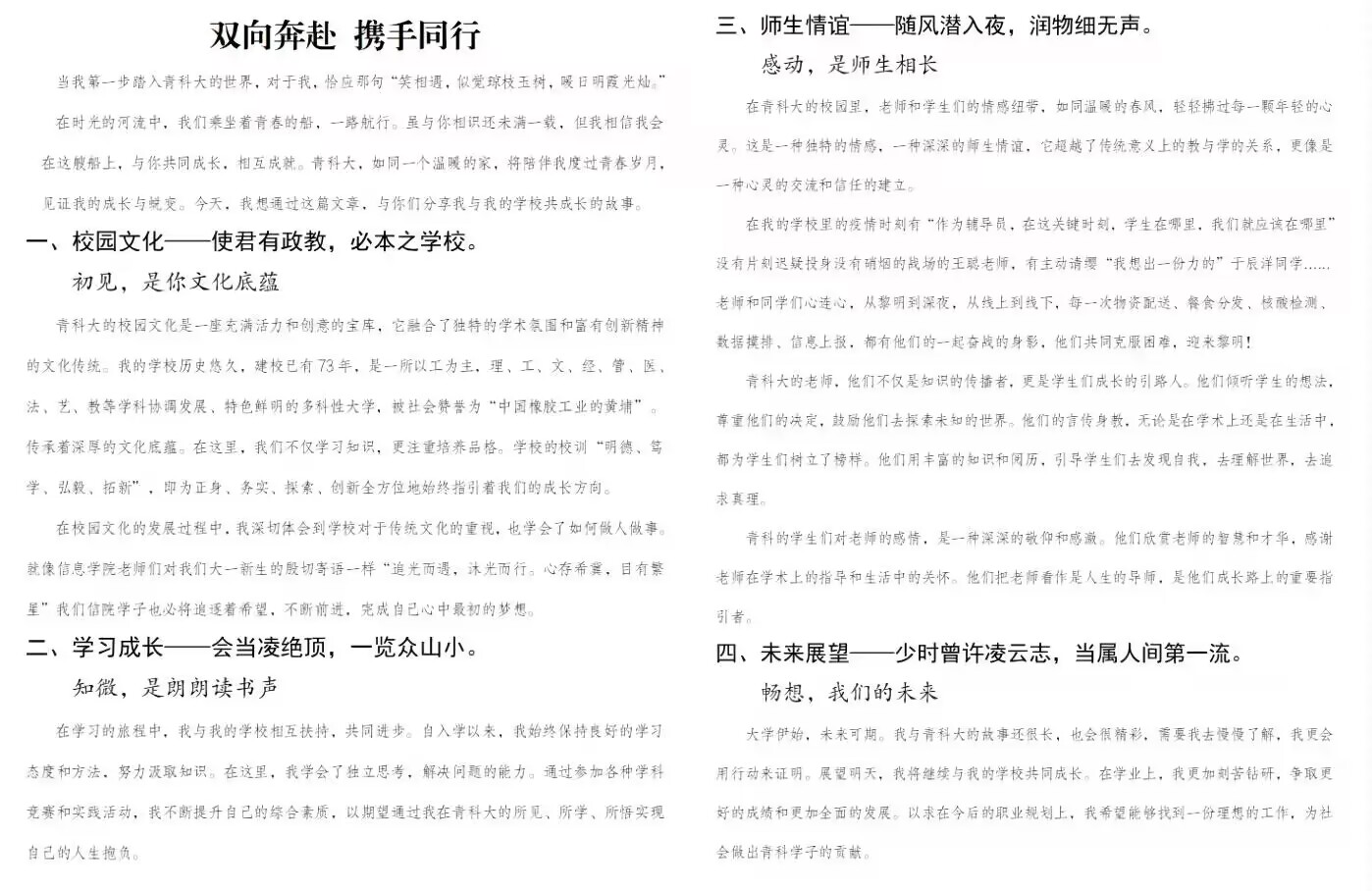 面向全体学生组织开展“我与青科共成长”主题征文活动。本次征文活动共有200余名同学参加,同学们用文字的方式讲述“我与科大”的动人故事,学生从不同方面、不同角度展现了在校的学习经历,畅谈了学校里的动人故事,描绘了学校发展的美好未来。