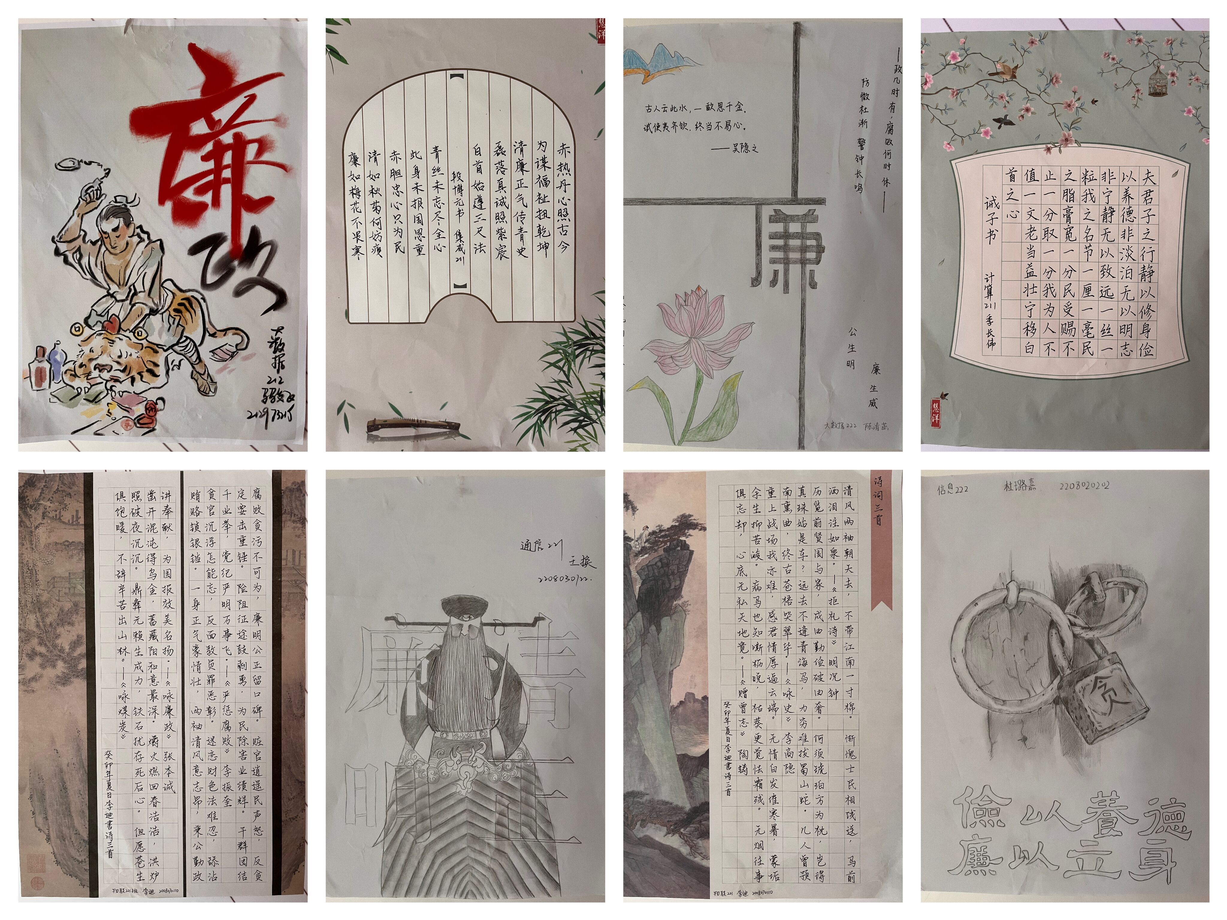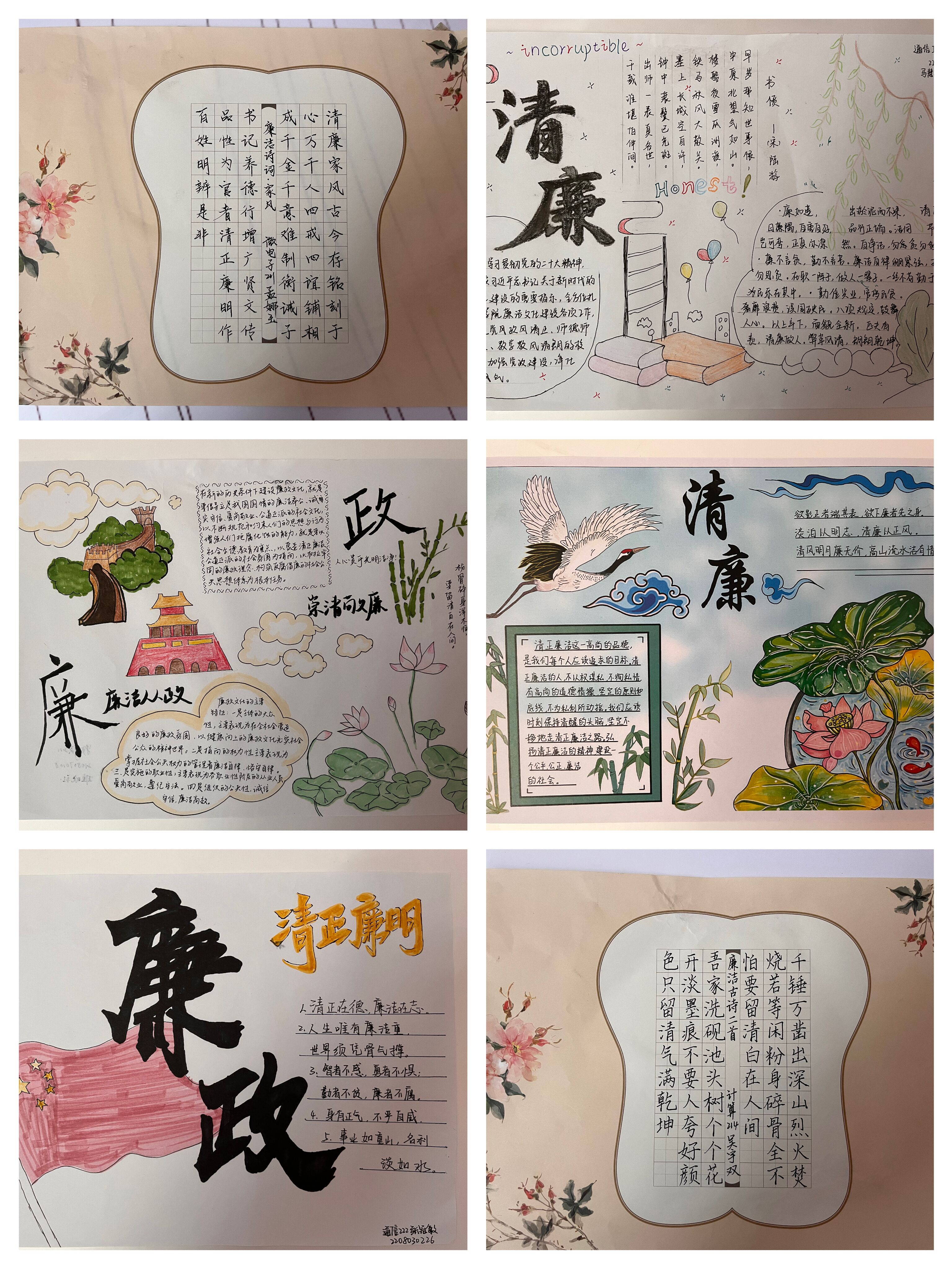 学生通过对廉政内涵的解读,进行书画作品创作,作品类型包括书法(硬笔和软笔书法)、彩绘、铅笔画、漫画、手抄报、设计海报等形式,生动鲜活的展现了廉政文化意蕴。其中20余项优秀作品入展,目前在学院楼一楼大厅展出,以供广大师生参观学习。
